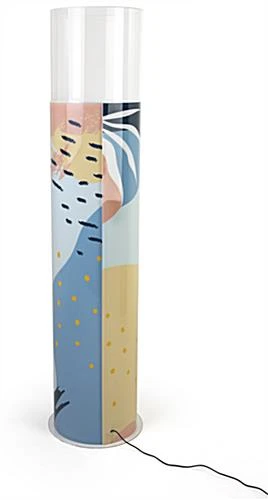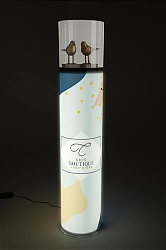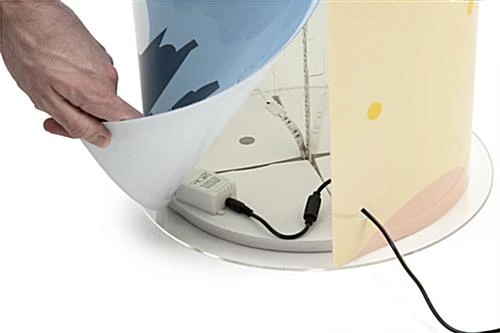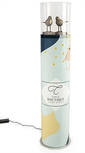 Fully brand this round pedestal display case with acrylic cover by uploading custom imagery and messaging to the wraparound graphic.