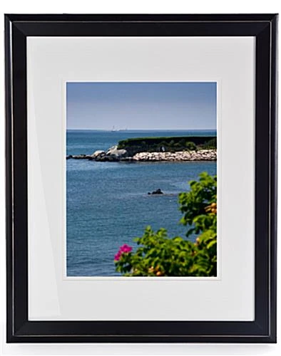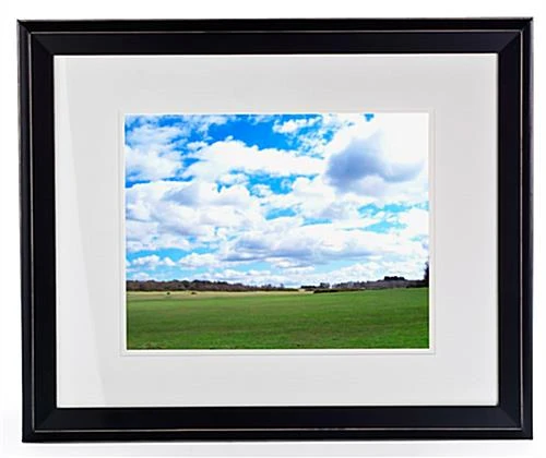 These wood photo frames are sold with a mat board. The 16” x 20” picture holders are matted down to display an 11” x 14” graphic. The large white matting creates an evenly border that surrounds a displayed print and positions it perfectly within the center of a fixture. Remove the matting and showcase a larger, 16” x 20” poster. These wood photo frames have a 1.625-inch-wide profile and a uniquely angled design. The rear-loading design allows for quick-and-easy updates. Also included are wall mounting hooks for attachment to any flat surface in either portrait or landscape orientation. These wood photo frames have a glass lens, as well.