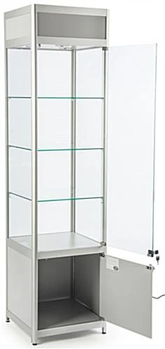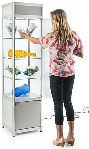 This light up retail tower is a beautifully designed display case that’s ideal for any business. The glass cabinet with LED lighting gives you an eco-friendly accessory when turned on. The silver retail tower also includes 3 adjustable shelves which is great for adapting to merchandise that’s larger in size. There are two key locks on the display case that are used for showcasing and storage to keep your products safe and out of sight. This retail tower ships unassembled to save on shipping costs and can be put together with a second helper. Give your business a quick upgrade with this beautiful accessory with LED lighting!