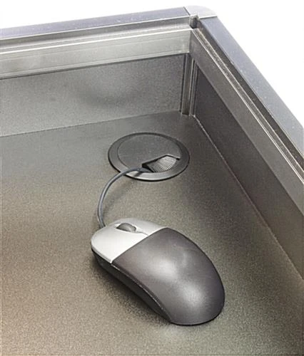 This cash wrap, cash counter features a recessed top shelf to hold a cash register or touch-screen monitor. A locking, pull-out drawer provides secure storage for a cash drawer, important documents and more. Below the cash drawer there are two levels of storage space. The shelf separating these levels is adjustable to accommodate the needs of the retail associates. Floor levelers are included on this cash counter to ensure stability on uneven surfaces. The cash wrap stand even features three vertically-aligned cord holes to feed wires or cords through (from the top level through to the underside of the cabinet). This ensures your cash counter always looks neat. Stop placing your cash register or drawer on your nice glass counters. This cash counter is the perfect solution! Crafted from powder-coated aluminum and silver laminate. Ships fully assembled.