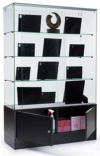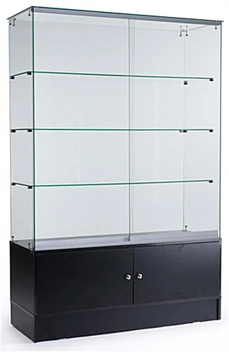 We use shatter-resistant tempered glass in the construction of our display cases, which will break into rounded pieces if an accident does occur. Small metal connectors hold the glass panels and shelving together, removing the chance of obstructing product views. This model features sliding doors with a lock and key system as well as bottom loading storage cabinets. Each glass showcase ships unassembled, saving customers money on shipping cost. Assembly is quick and simple. Typically two adults can unpack, build, and make this display ready for the sales floor in 25 minutes or less.