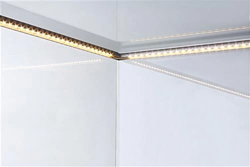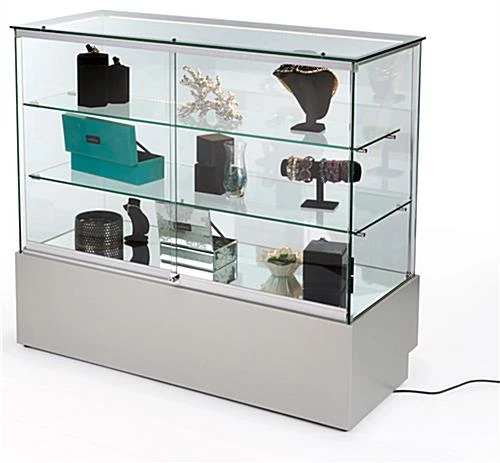 This high-end retail showcase, LED-lit jewelry display case can be used as part of a unique configuration with other store counters. As part of the Grace Tyler series, this shop presentation case will enhance any commercial location. Each jewelry display case with LED lights features floor levelers. This adjustable feet ensures each counter will remain stable even on slightly uneven surfaces. Each full vision glass jewelry display case with LED lighting is enhanced by a solid silver base, giving the frameless counter a polished and sophisticated look. Along the bottom of each counter, is a recessed toe kick, ensuring any accidental scuffs will not be visible to customers. This store showcase is the ideal LED-lit jewelry display case merchants would want to use for upscale retail stores!
