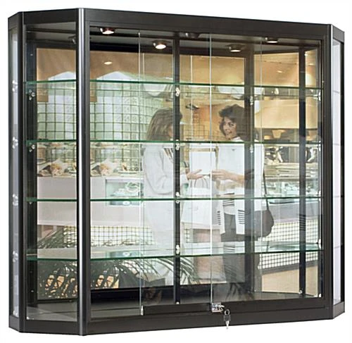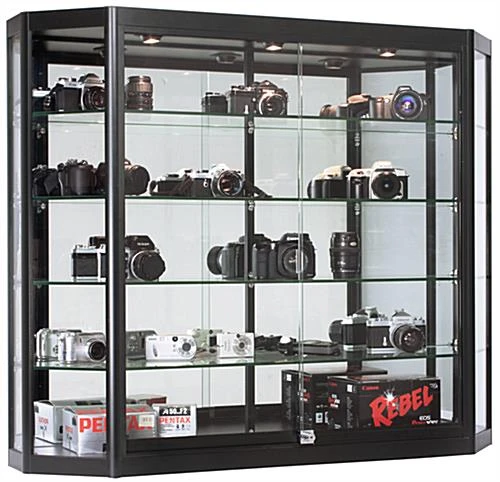 Free up floor space in your store by placing items in this wall mounted LED display cabinet which features adjustable glass shelves and overhead lighting. Robust aluminum framing promises long lasting use of this case in any busy environment. These lockable display cabinets come with a plunger and key set that offers peace of mind knowing your merchandise is safe from accidental breakage. Each of the 4 tempered glass shelves sits on adjustable rubber padded clips to hold larger items with a maximum load capacity of 30lbs. For your convenience a power switch is located inside the sliding glass doors to turn the lights off without having to search for the outlet. Grab a display cabinet for your business to take advantage of this unique angled case design and efficient lighting system!