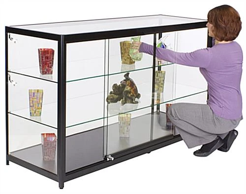 This retail display counter with LED lights is the perfect accessory for your new start up boutique. These store fixtures are ideal for showcasing jewelry, collectibles, or other high end merchandise that you would like to keep safe from public handling. The see-through display counter is equipped with 2 adjustable tempered glass shelves so that you can add items of different sizes. The cabinets also have foot levelers at the bottom of the aluminum base to adapt to uneven floors. Your jewelry will be safe within the confines of the store fixture by utilizing the push-in lock on the back side of the display counter. Combine this cabinet with others in the Essentials line to create a seamlessly designed configuration for your showroom.
