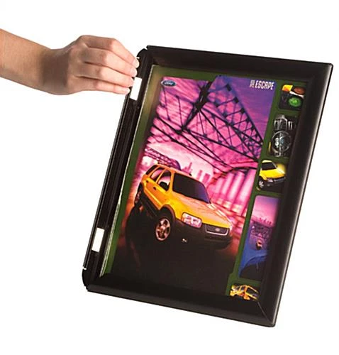 This sign holder, quick clip snap frame is great for displaying photos, advertisements, and other 8.5″ x 11″ prints. This snap frame can be used as a wall mounted or countertop display. Four hinged sides flip open and close in a snap for quick and easy graphic changes. This snap frame also features a black metal border that has a matte finish and slim profile. A non-glare lens covers your sign and protects it from damage. This quick clip snap frame, also known as a sign holder, comes with a fold out easel made out of molded plastic. When used as a countertop sign display, this easel can easily change from a vertical or horizontal position. The frame can also be mounted to a wall; screws and anchors are provided. This snap frame holds 8.5″ x 11″ prints, however, a portion will be covered by the frame.