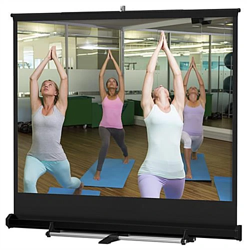 The actual projection area is 8′ x 8′, allowing for large images, statistics, or video to be shown to an audience or meeting group. This retractable projector screen weighs 50 lbs. Businesses that conduct frequent conferences or lectures buy this portable projection system to share pertinent corporate information for all to see. Schools use this retractable projector screen in their lecture halls and classrooms to further reinforce the lesson plan of the day, or to show an education video. The size of this portable projection system is so large that it can easily be seen from any seat in the room. This retractable projector screen that features a large surface area makes it possible for people in the back of the room to clearly read any text or important facts that are displayed on the screen. When not in use, the metal cassette can be laid flat, or stood on end and stored in a closet or under a table. No matter what the need, this retractable projector screen will satisfy your projection needs.