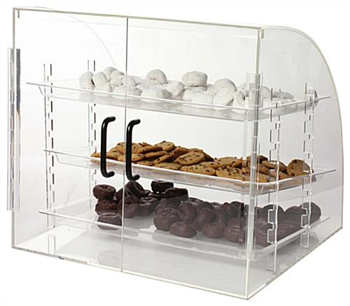 This countertop food display case, known as a bakery bin, is great for storing pastries, donuts, bagels and more. These stands have two hinged rear-loading doors. This countertop food display case that is acrylic allows employees to quickly access food while behind the register. The curved convex design of this bakery stand adds a touch of style to any counter. Each acrylic countertop food display case has three removable handwash-only trays, which is ideal for taking heated food and sliding it directly into the container. These plastic trays are also height adjustable. This bakery countertop food display case has slotted sides, so each shelf can be set to a different level.