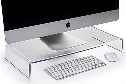 This acrylic monitor stand features a classic waterfall design manufactured from hand-bent clear plexiglass. Mix up your office computer with this modern fixture that complements any environment. Organize and conserve workspaces with this desktop monitor stand that has keyboard storage underneath when not in use. Reduce neck and eye strain by raising your computer on the clear riser for a more ergonomic and safe work day. With sturdy plexiglass construction, this monitor stand supports screens up to 31 pounds. Great for use at home or in the office, this desktop riser with keyboard storage provides function to your workspace and helps workdays run more smoothly.