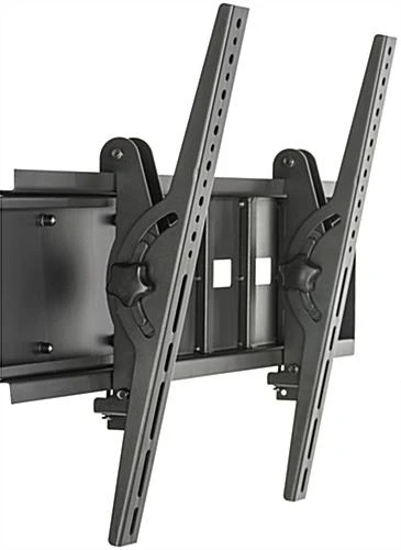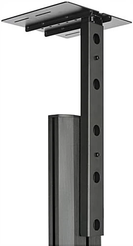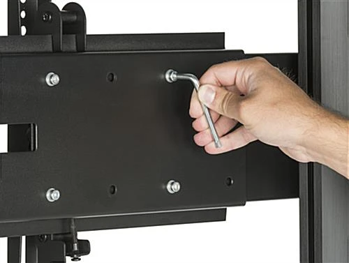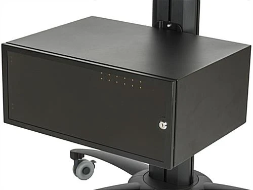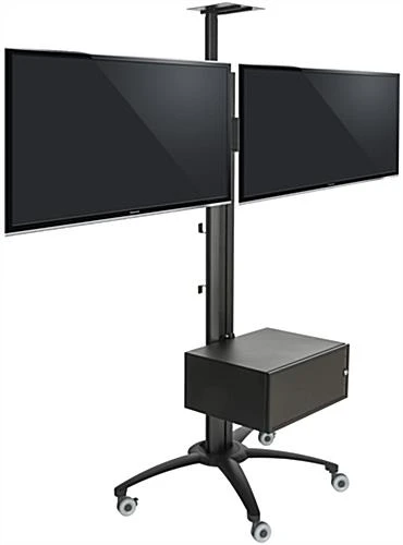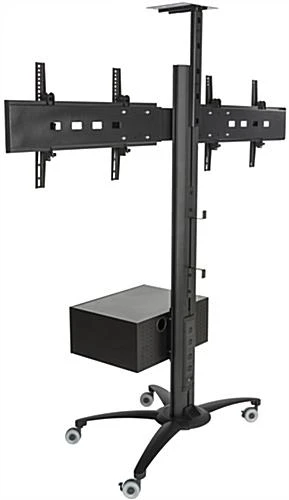 This dual screen TV stand with power distribution is crafted from aluminum and steel for durability and is finished with a black powder coating providing a contemporary look. Mount your VESA compatible LCD monitor with ease using the included hardware. Electrical outlets are integrated into the black TV stand, along with a 59” extension cord offering just one wire to extend to the wall. Cables maintain structured with the included winder on the back of the column. Keep equipment safe while at events by locking the cabinet with one of the two included keys. Mount LED and LCD monitors or other VESA compatible flat panels to the brackets in sizes ranging from 30” to 60”. Showcase your business in style with this TV stand that is sure to last!