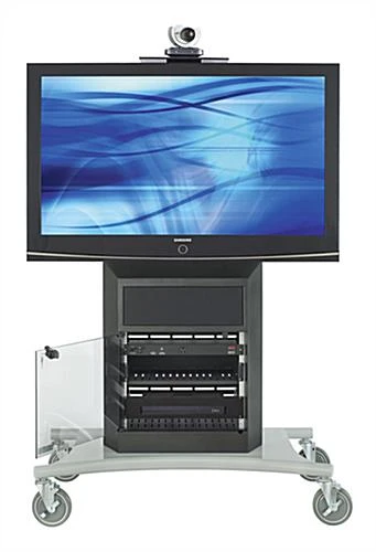 These audio visual carts that support one screen up to 70″ in size are easy to view! The universal VESA bracket accommodates nearly any model television within the size and mounting pattern constraints. These video conference equipment stands, audio visual carts that include a camera shelf are well equipped for conference rooms. The 5″ caster wheels are easy rolling even under the weight of a large flat screen and various electronic equipment. These audio visual carts that are constructed of steel are designed to provide a lasting TV display. The tinted, tempered glass door is locking to secure expensive AV devices. Featuring an AmpliVox® speaker, these audio visual carts are equipped with every feature needed for a flawless presentation. The integrated camera shelf is ideal for virtual meetings in offices. These audio visual carts have extensive ventilation to provide cooling to electronic devices and ensure air flow. Inside the cabinet, there is one shelf in addition to a rack mount storage system. The 8RU (rack unit) 19″ bracket within these audio visual carts is ideal for organizing equipment. Users can install DVD players, cable boxes, and more within the locking storage.
