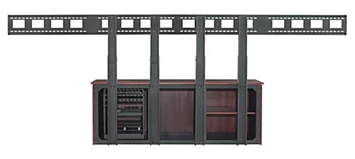 This dual mount TV stand that has a sleek wood veneer finish has an open back design for ventilation. The 6-plug power bar can be installed on the rack to organize the AV devices. This LCD monitor display, dual mount TV stand that is sturdy, is designed to be a lasting fixture in an office. Each technology credenza is designed to hold large screens with a total weight capacity of 400 lbs. This dual mount TV stand that includes rack storage makes it easy to install AV equipment. The standard 19″ rack has 12RU (rack units) of space to accommodate many devices. This dual mount TV stand is ideal for conference rooms that may need to be reconfigured. Wall brackets are a more permanent solution, whereas this credenza can be moved when the meeting table and other furniture is moved. The rack storage slides out and rotates for easy access. The open bays inside of this dual mount TV stand are spacious. The cabinet is an ideal space to hide office supplies, a mini fridge, or other items that are not ideal in plain sight. This dual mount TV stand holds two screens up to 80″ in size for a highly visible video conference. Users can show a presentation on one monitor and a virtual conference on the other!