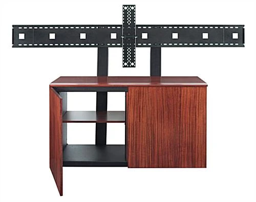 This contemporary TV mount stand, also known as a flat panel credenza, is equipped with rack storage. This standard rack is 19″ wide with a depth of 17″. This office TV mount stand includes many deluxe features and a contemporary style. The mahogany veneer is stylish and gives an elegant appearance. The integrated camera tray is adjustable to provide an ideal viewing angle for a video conference. The credenza features an open back design for ventilation of electronic equipment held within. This sleek LCD office furniture is designed to be a lasting fixture. The initial investment is well worth the long lifespan and numerous meetings that will benefit from this display. Manufacturer model# Credenza2-V.