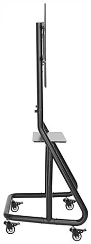 This modern black rolling TV station is height adjustable, ranging from 56″ to 60″, providing attendees the perfect viewing angle during presentations at school, work, trade shows, libraries, and more. The floor standing monitor mount has a heavy-duty bracket that can hold 60″ to 105″ screens up to 220 lbs. Our height adjustable modern black rolling TV station features four locking casters that allow it to move effortlessly between locations and conveniently lock into place for added stability when not in use. Ideal for high-traffic areas, this mobile stand has a heavy-duty steel frame with a powder-coated finish that can withstand years of use. This contemporary cart features a durable AV shelf that can hold up to 55 lbs for storing school or work supplies, equipment, and more. This monitor mount offers anti-theft locking for additional security, ensuring your device will not be tampered with when unattended. Use this adjustable modern black rolling TV station with locking casters to assist your promotions, advertisements, and more during presentations or meetings.