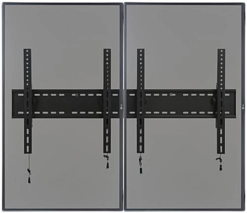 Showcase a seamless dual display above your checkout area with this 2-monitor wall portrait TV bracket. Complete with steel construction and a black finish, this flat panel holder was made for long lasting use. Varying degrees of tilt allow the versatile wall portrait TV bracket to adjust on a whim without the use of tools. Hang a series of dual display flat panels to create a virtually borderless large viewing screen. Proudly showcase advertisements or business information to passersby in universities, stadiums, restaurants, and more. Each portrait TV bracket, featuring ten to fifteen degrees of tilt, comes with the necessary hardware to hang the fixture as well as many popular models of screens.